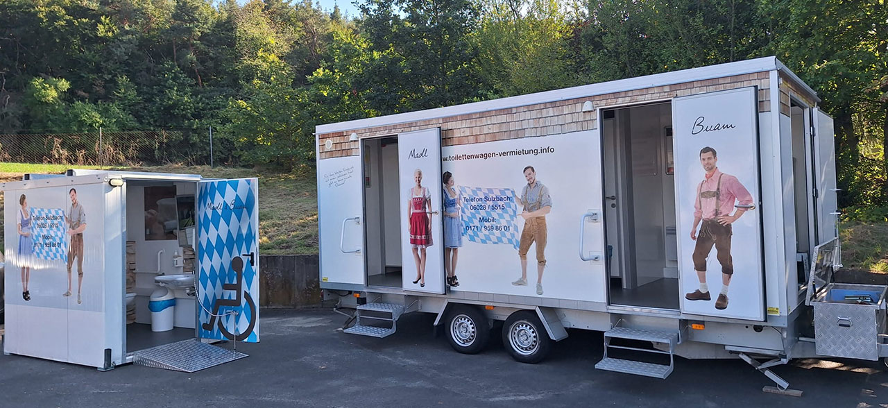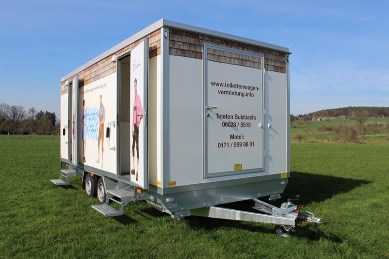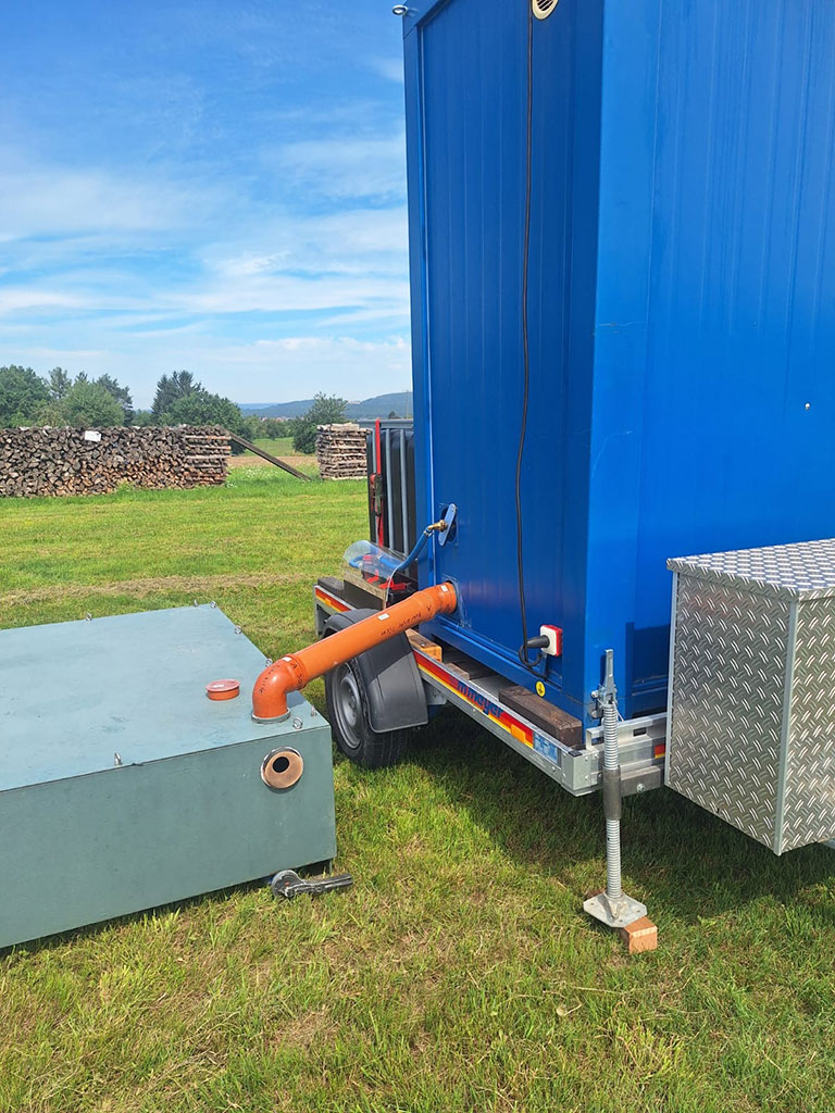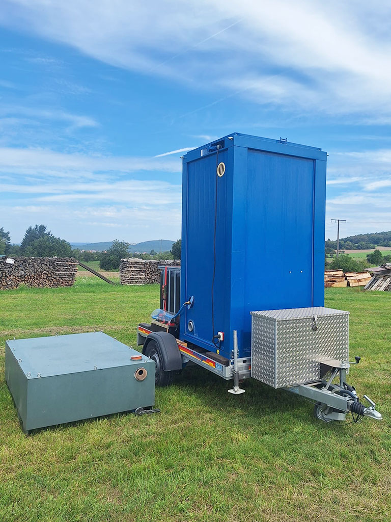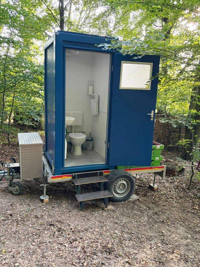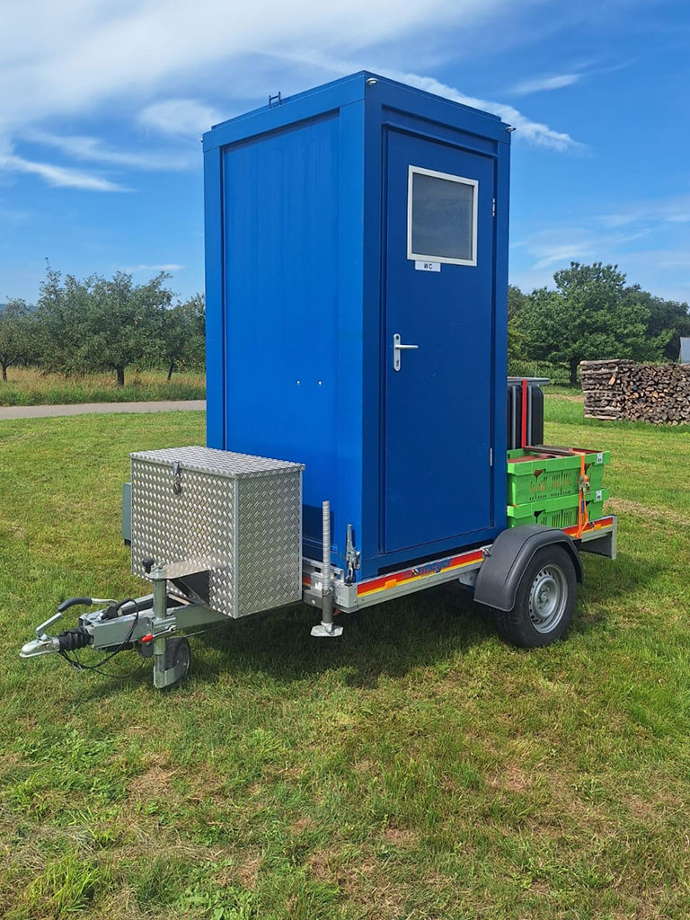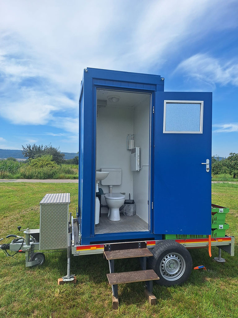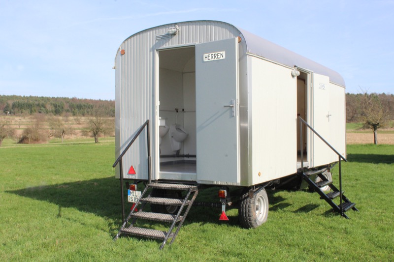 Saubere und gepflegte Toilettenwagen in unterschiedlichen Größen und ein Toilettencontainer stehen zur Verfügung.