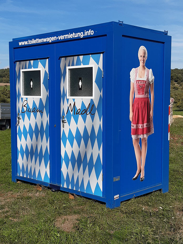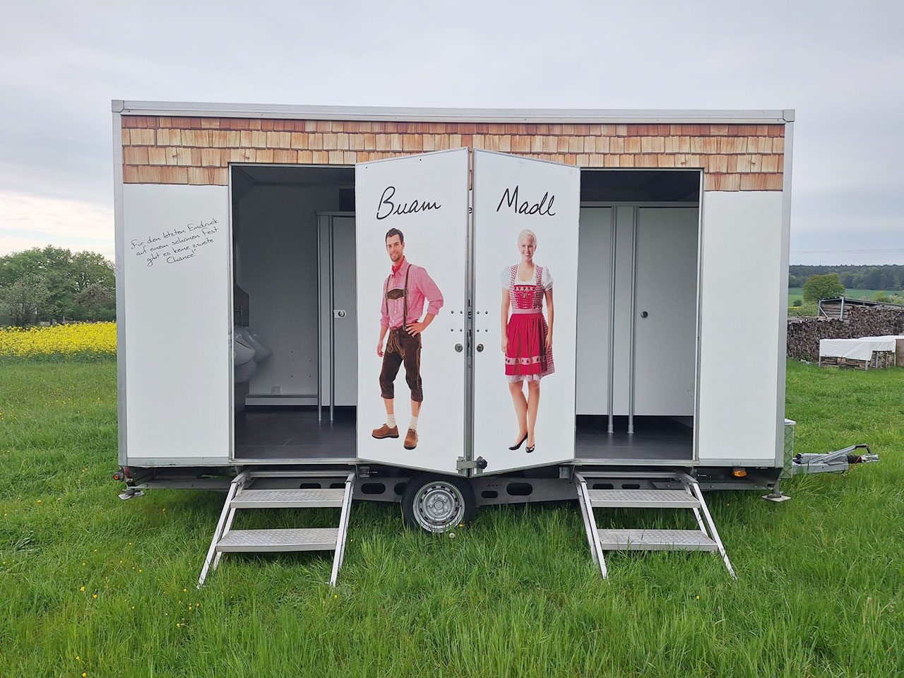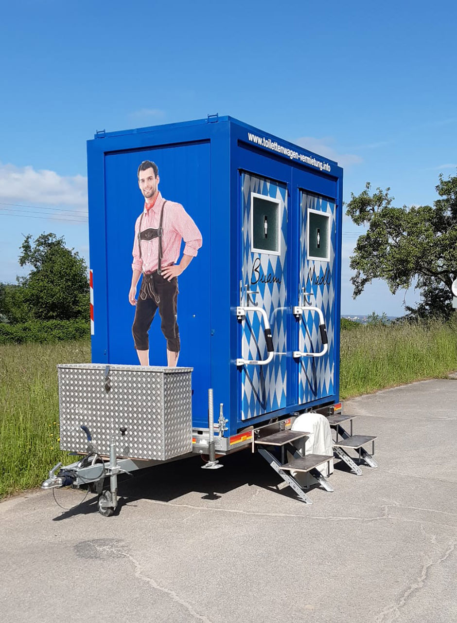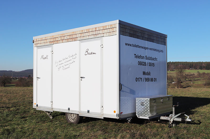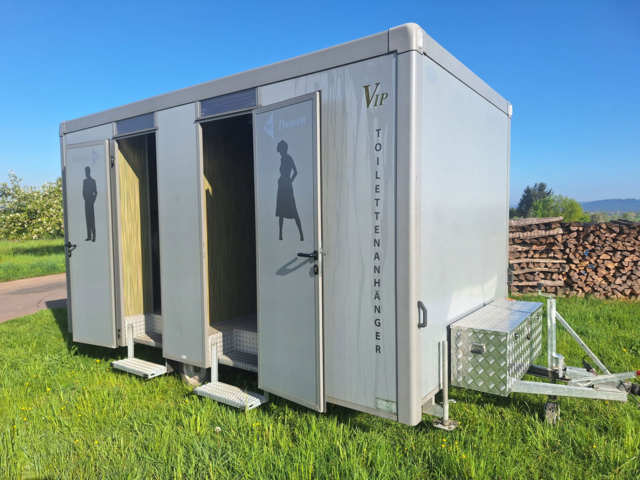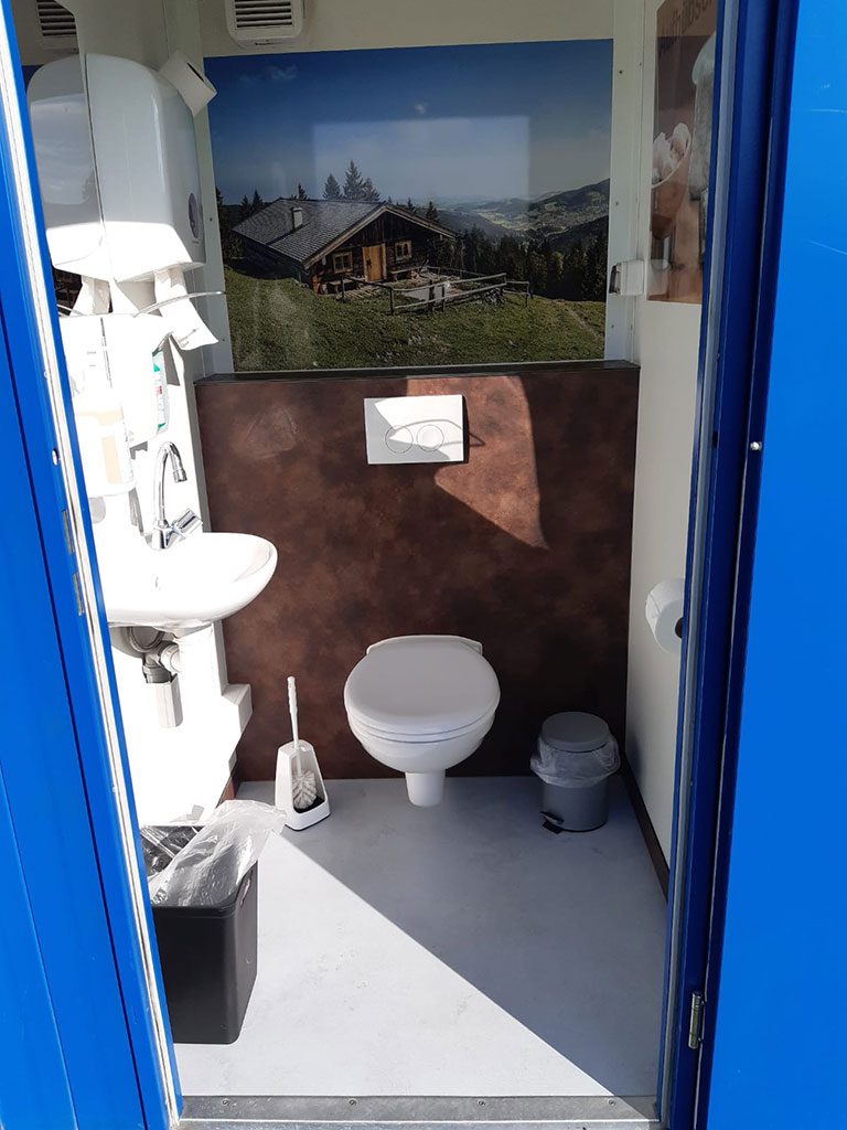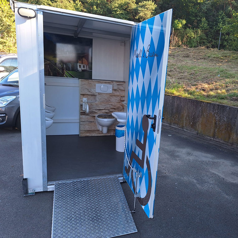 Saubere und gepflegte Toilettenwagen in unterschiedlichen Größen und ein Toilettencontainer stehen zur Verfügung.