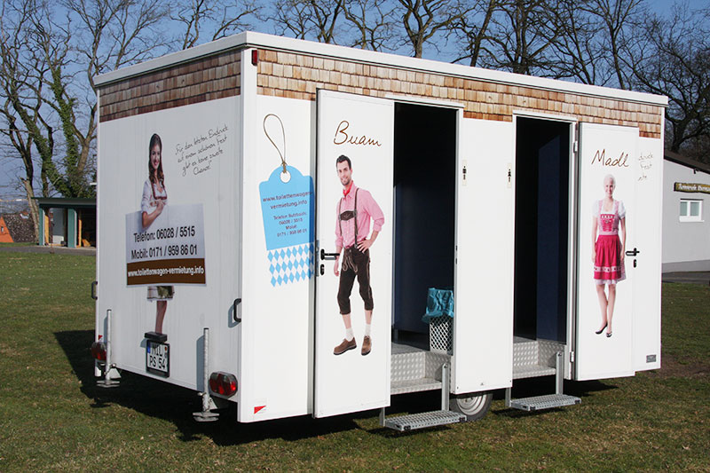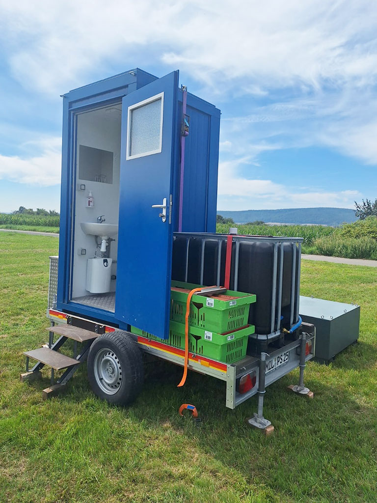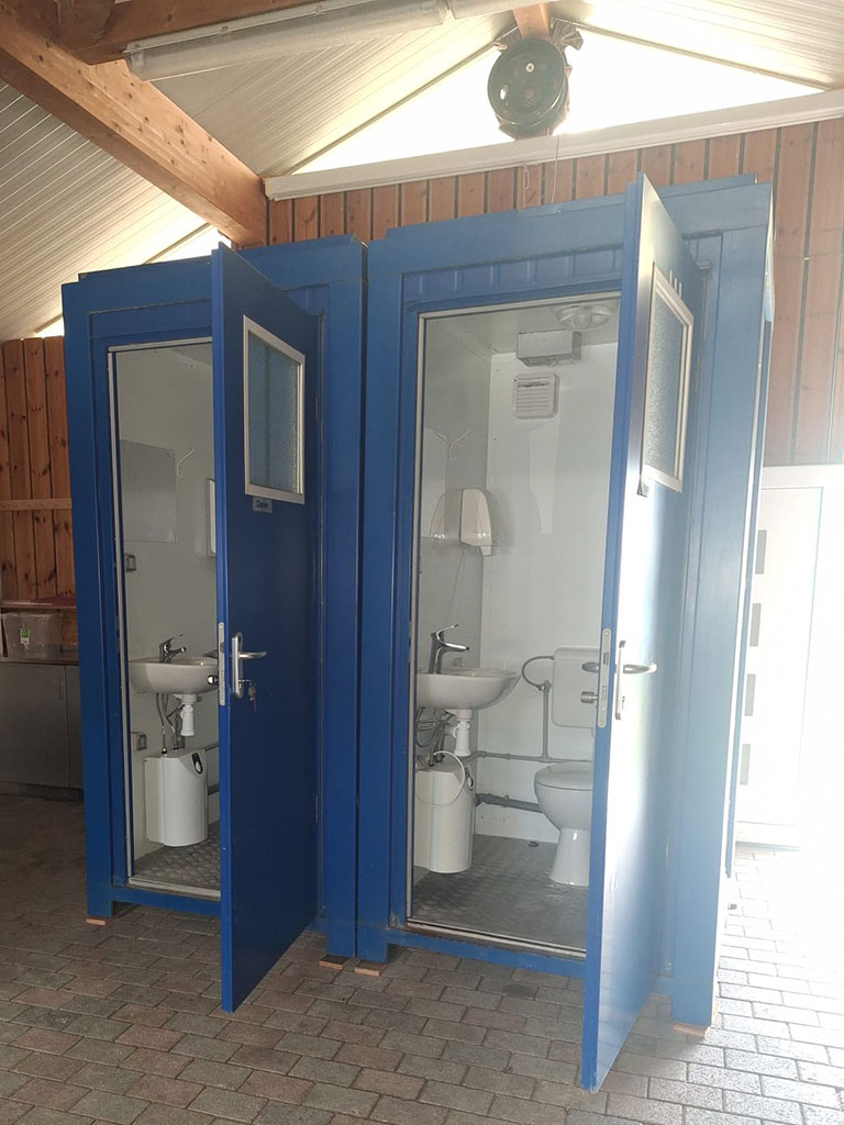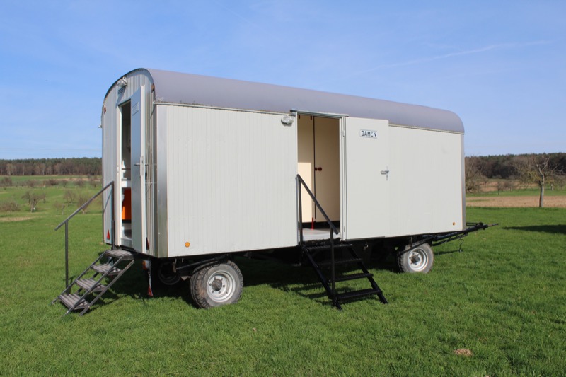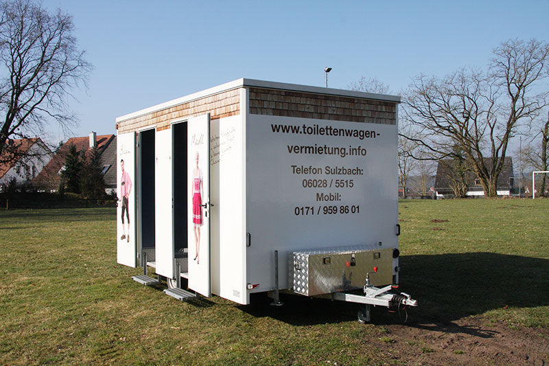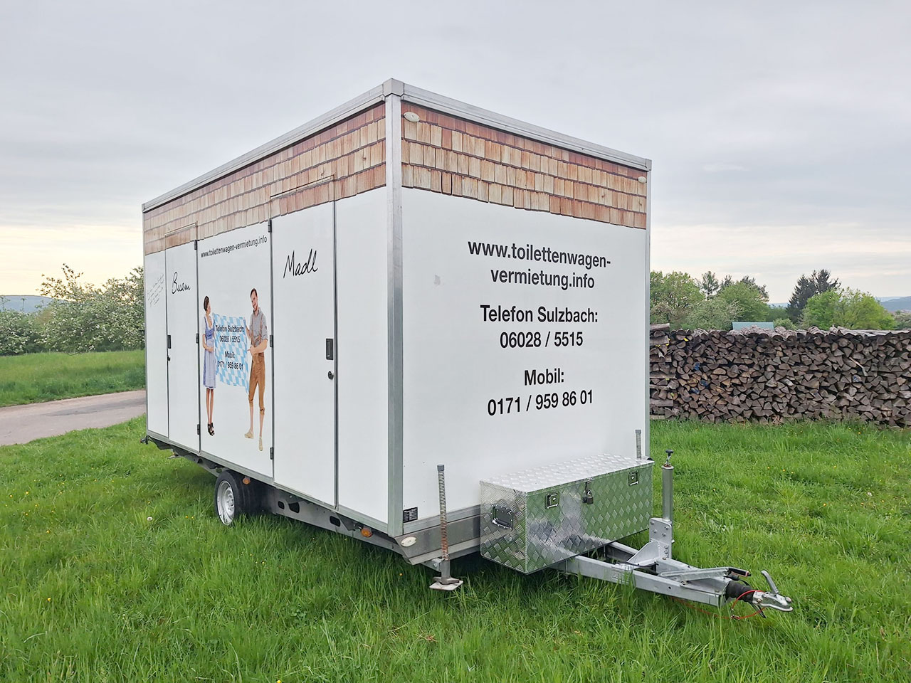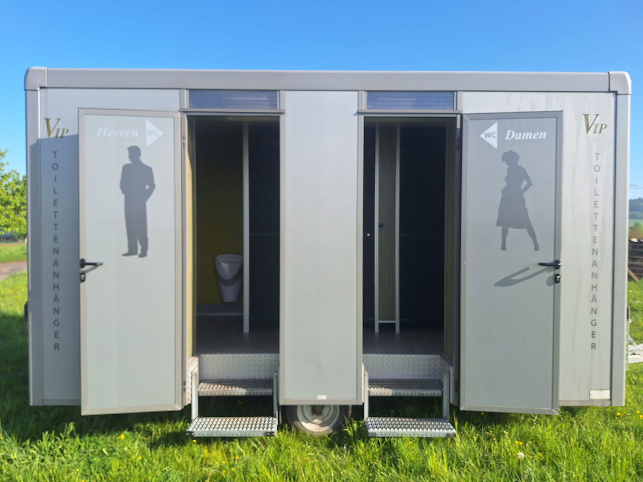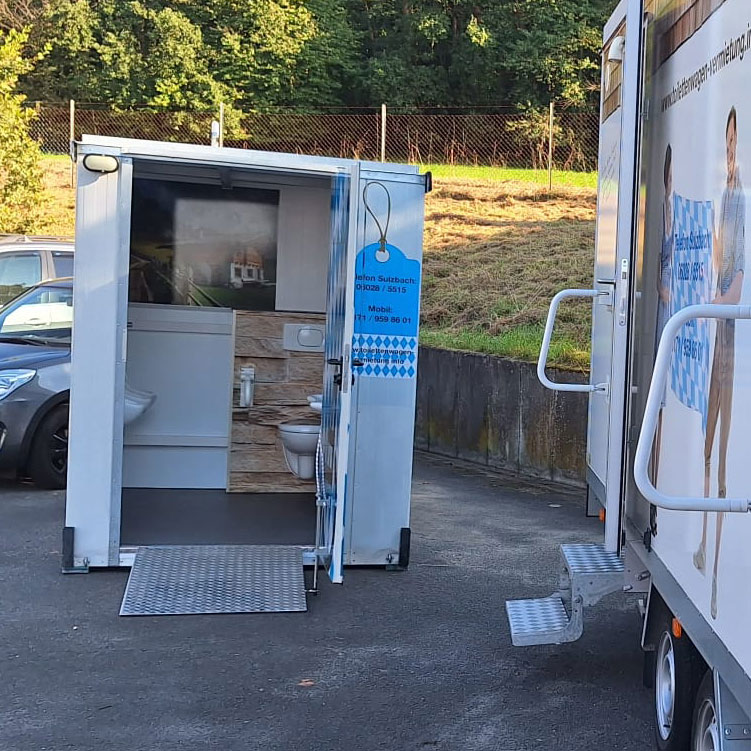 Saubere und gepflegte Toilettenwagen in unterschiedlichen Größen und ein Toilettencontainer stehen zur Verfügung.