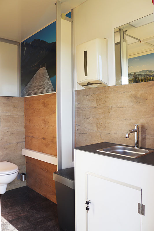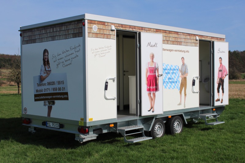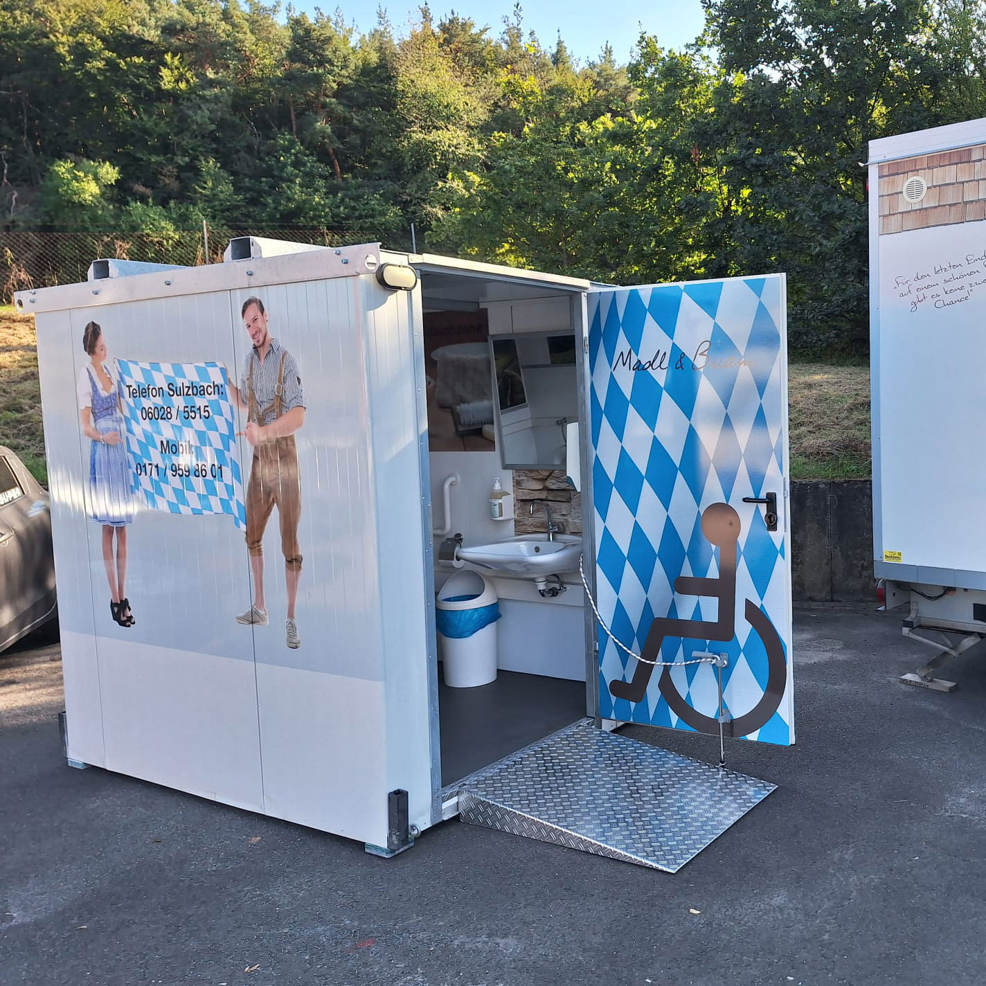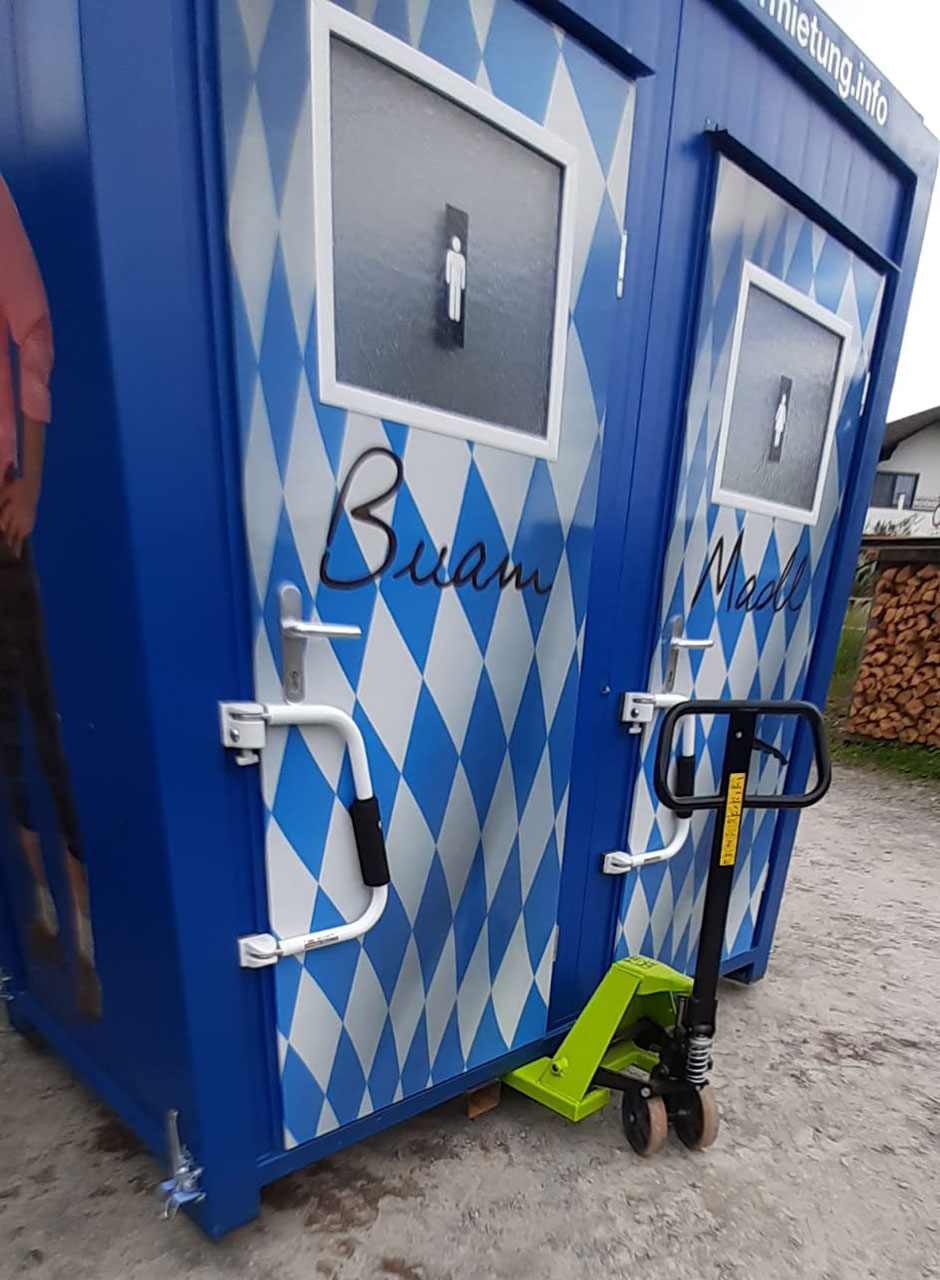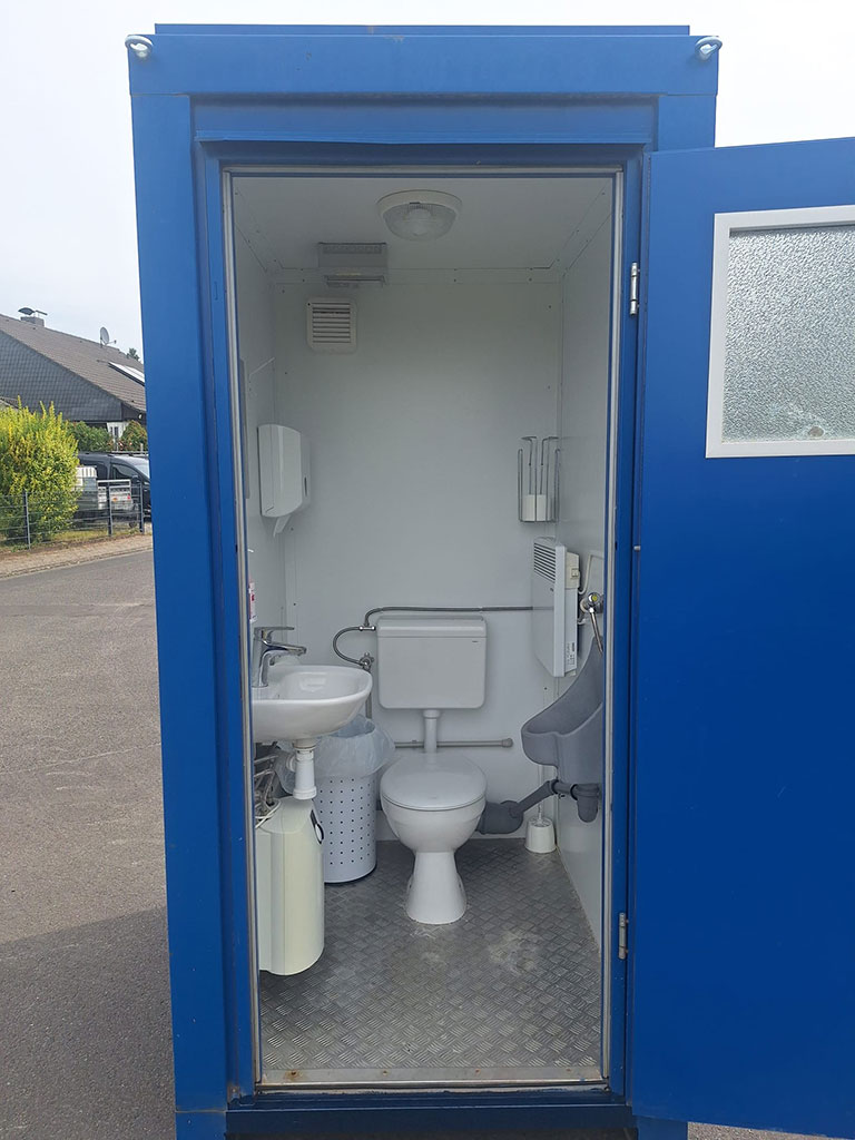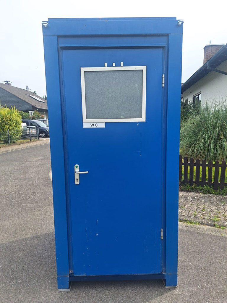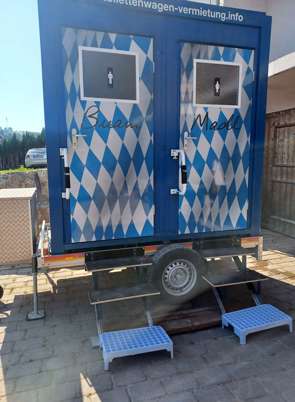 Saubere und gepflegte Toilettenwagen in unterschiedlichen Größen und ein Toilettencontainer stehen zur Verfügung.