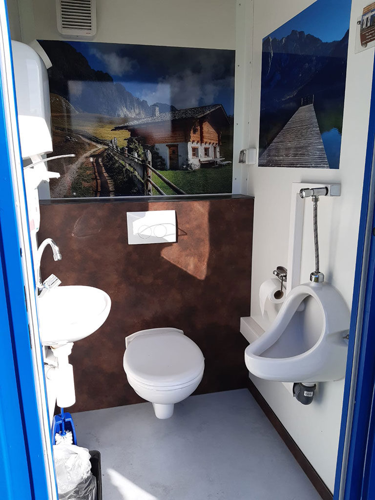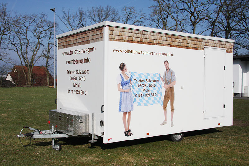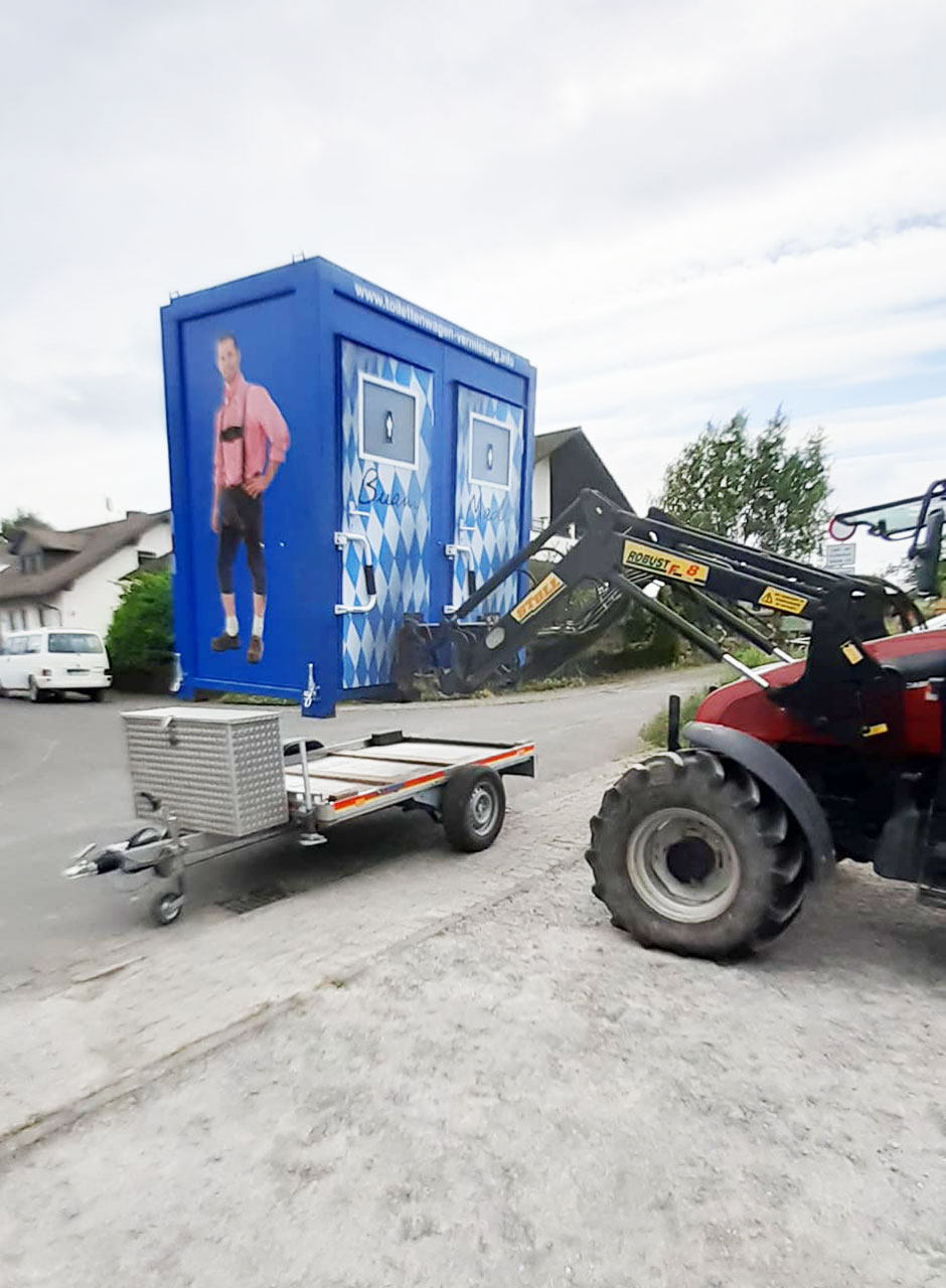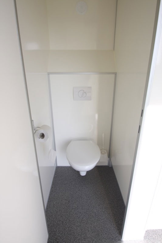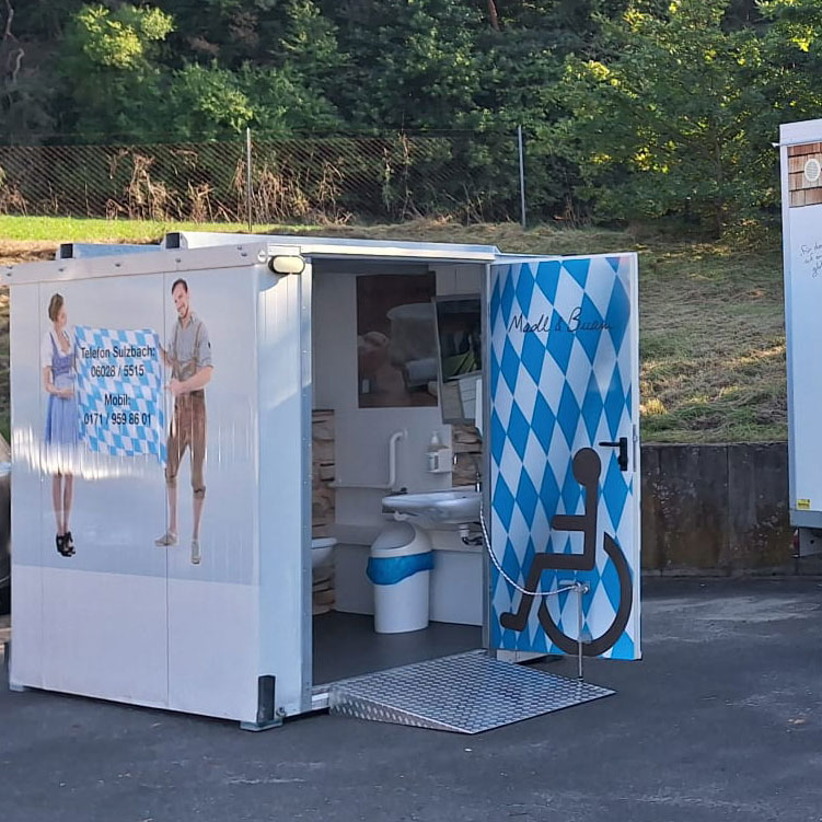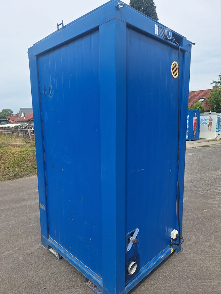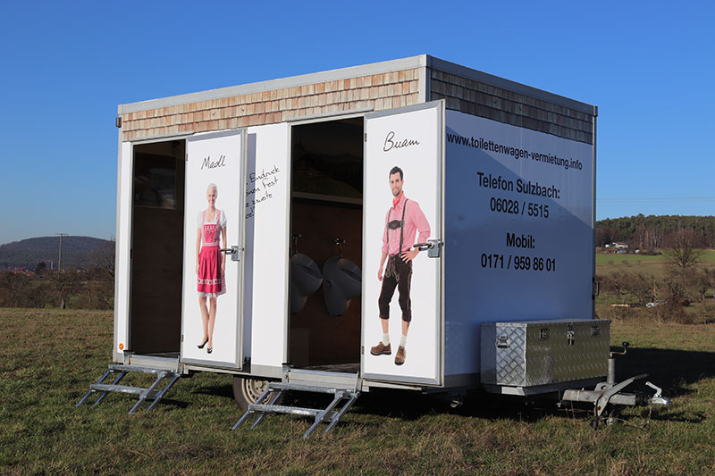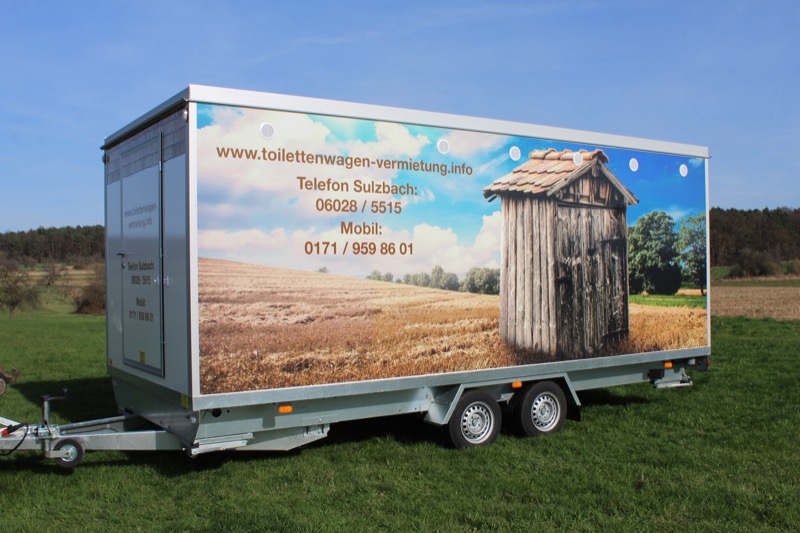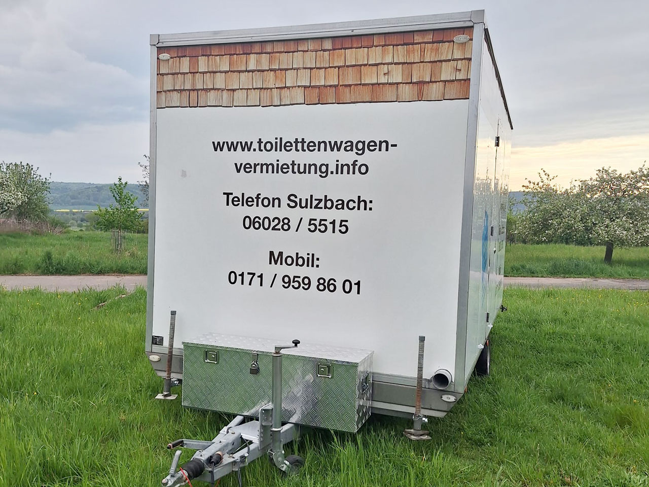 Saubere und gepflegte Toilettenwagen in unterschiedlichen Größen und ein Toilettencontainer stehen zur Verfügung.